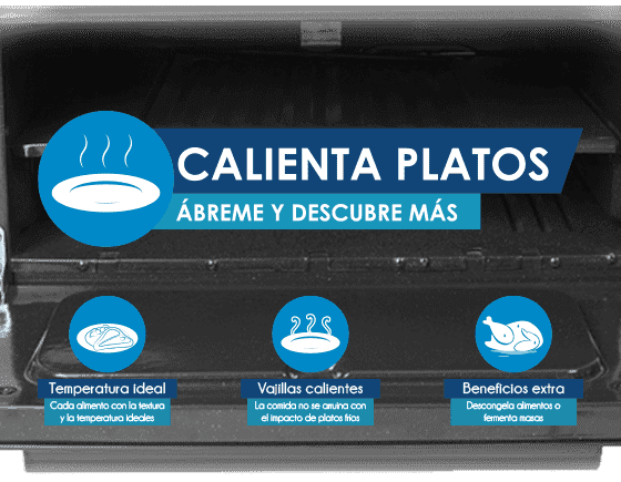 Cuenta con un practico Calientaplatos (asador [puerta inferior]), que sin gastar más te brinda el calor que necesitas para calentar alimentos y vajillas.